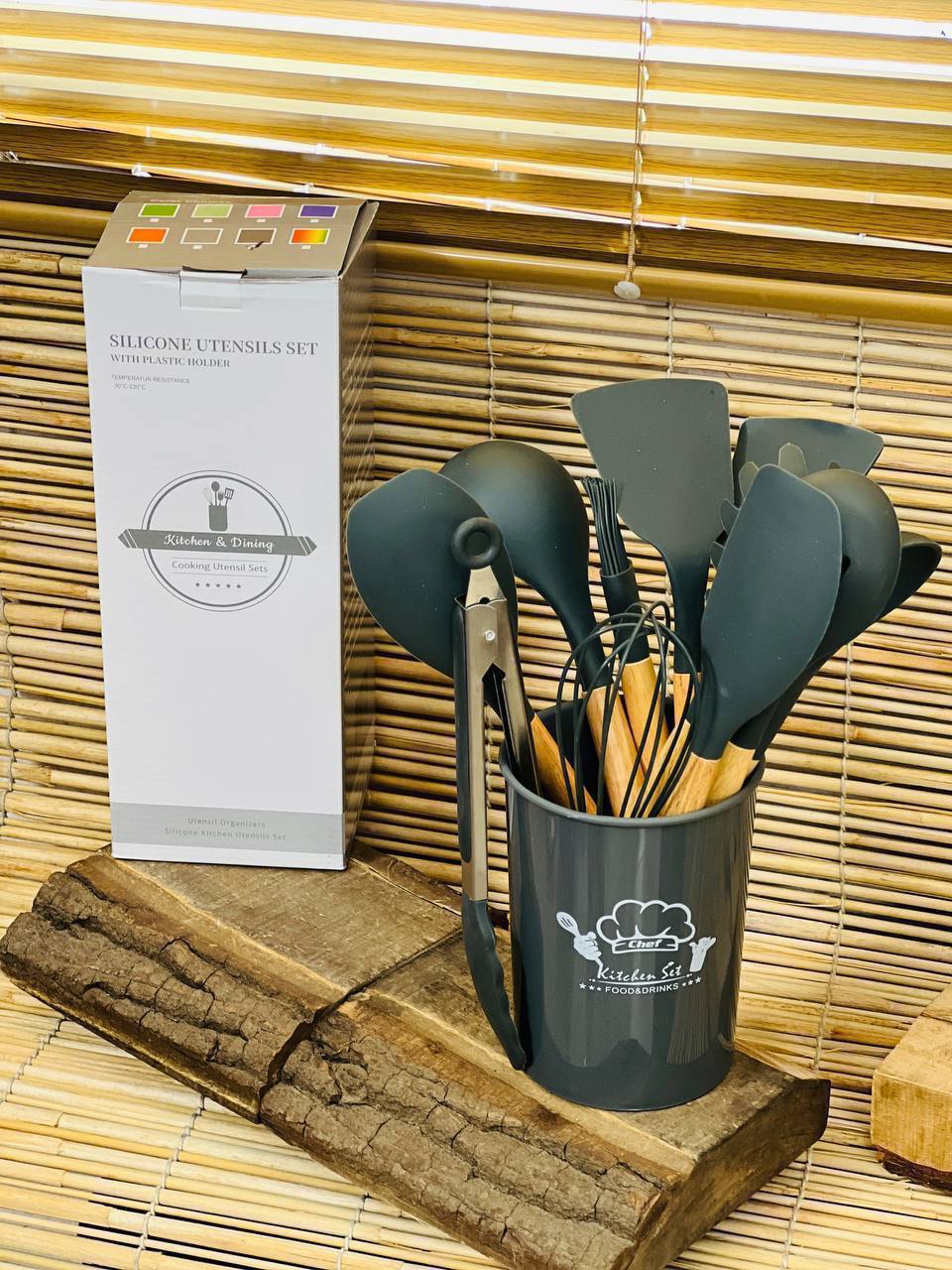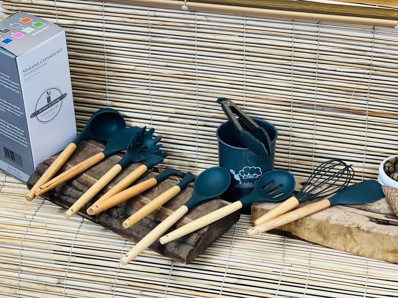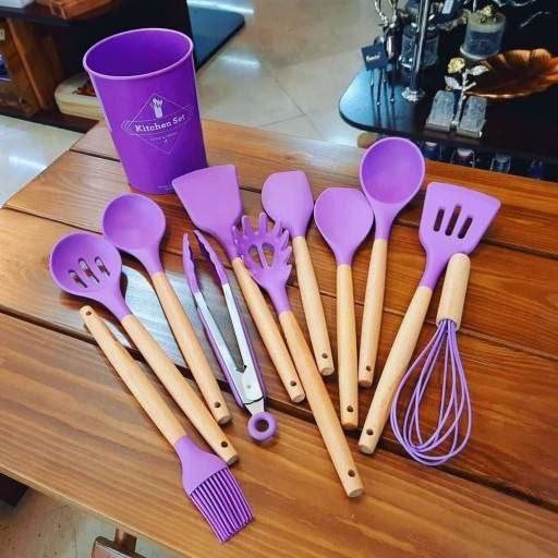 این مجموعه شامل 12 عدد ابزار آشپزی سیلیکونی است که هر یک دارای دسته‌های چوبی و سری‌های سیلیکونی مقاوم به حرارت هستند. ابعاد کفگیرها و ملاقه ها بین 25 تا 30 سانتی‌متر متغیر است. جنس سیلیکونی ابزارها فاقد BPA و غیرسمی است، که برای ظروف نچسب مناسب و بادوام می‌باشد.